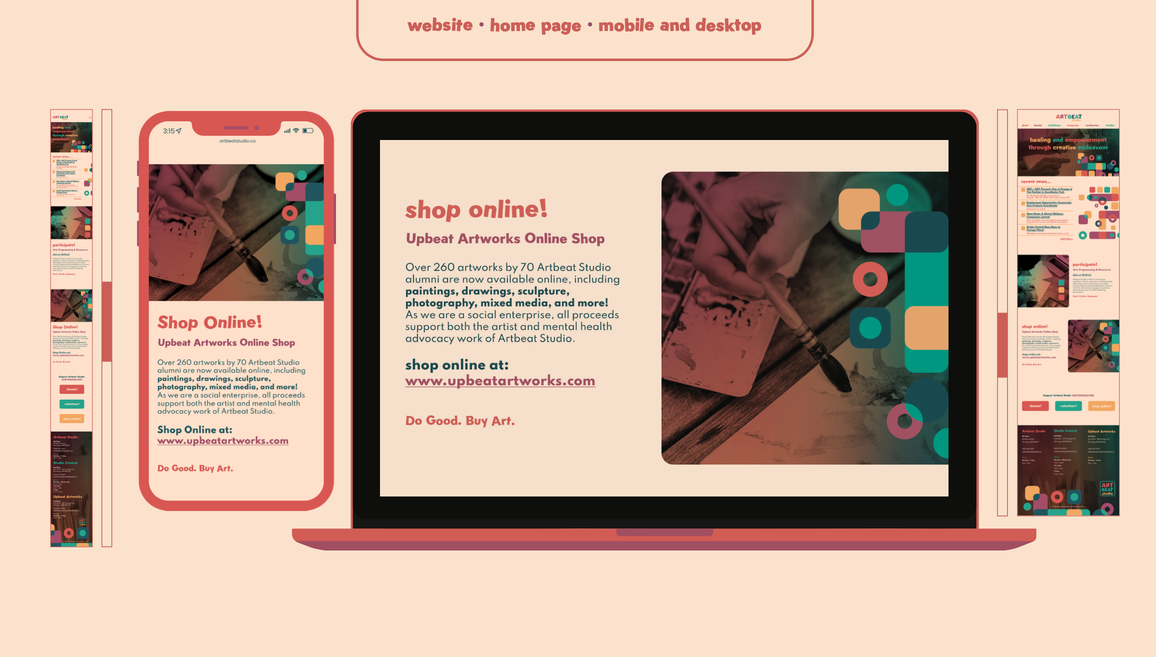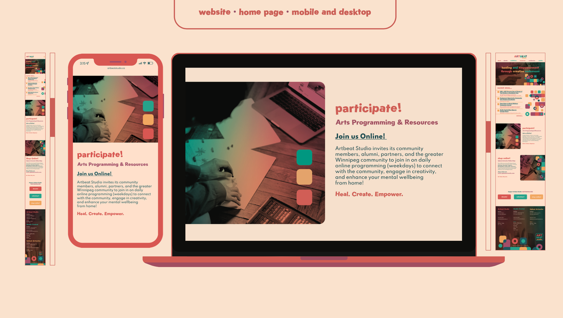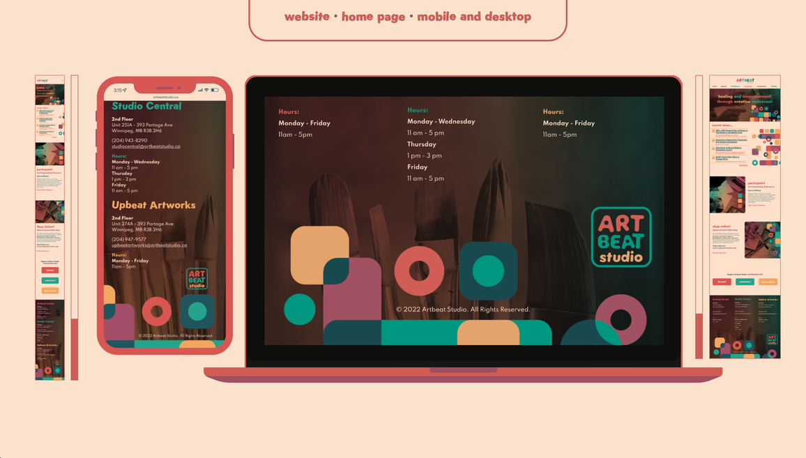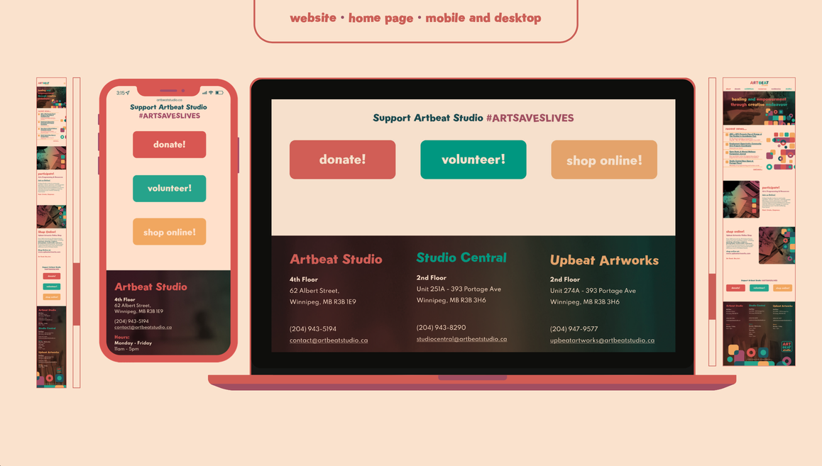 The next step was to design a website taking Artbeat’s current website content, and plug it into the new brand identity. The new website encapsulates all new brand elements, and applies it to both desktop and mobile. It develops hierarchy for all the information and organizes it in a way that helps you find what you’re looking for faster.  It creates a welcoming and engaging digital environment.